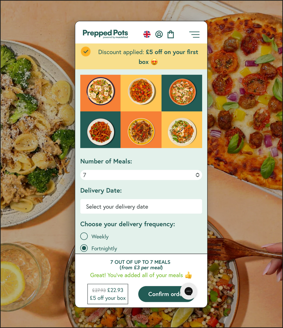 We partnered with Prepped Pots to create a custom-built Shopify site focused on a seamless buying journey and bundle builder. Customers can effortlessly select their meal plans and customise their orders, with a bespoke account section ensuring easy subscription management and delivery date selector.